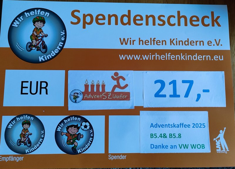 Wir bedanken uns beim Betriebsrat und dem Vertrauenskörper der Bereiche B5.4 & B5.8 von VW Wolfsburg ganz herzlich für die Spende vom “Adventskaffee”.