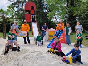 Der Verein "Wir helfen Kindern" aus Salzgitter vertreten durch den Vorsitzenden Volker Machura und Schatzmeister Jürgen Kinzel und die add solution GmbH aus Wolfsburg vertreten durch Geschäftsführer Bernd Schober überreichten Spenden von insgesamt fast 3500 Euro für neuen Sand für die Natursandkiste an FSB-Jugendwartin Carolin Giffhorn im Beisein einer Kinderschar. DANKE"