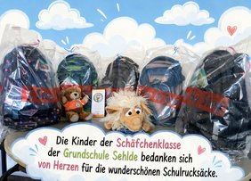 vielen Dank für die tollen Rucksäcke, die wir den einzelnen Familien unserer Viertklässler jetzt zur Verfügung stellen können. Stellvertretend für die Kinder hat sich das Klassenmaskottchen Lucy mit eurem Teddy fotografieren lassen. Danke, danke, danke, dass Ihr an die GS Sehlde gedacht habt.