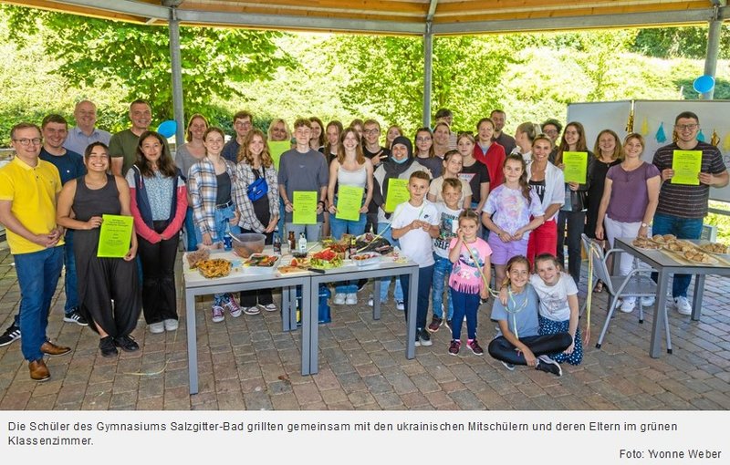 Von Montag bis Donnerstag paukten teilweise 20 Erwachsene und 10 Gastschüler mit den Gymnasiasten 45 Minuten Deutsch. „Einfach grandios, was unsere Schüler auf die Beine gestellt haben“, lobt Schulleiter Hans-Günter Gerhold seine Schüler. „Sie verzichteten auf ihre Mittagspausen, um zu helfen. Da es dann sehr viele Helfer gab, war eine individuelle Förderung möglich. Das ist Lernen auf der persönlichen Ebene, wo einige Freundschaften entstanden sind. Toll!“ So fanden sich auch Polina und Greta. „Ich bin sehr dankbar über dieses Angebot. Es hat mir sehr viel geholfen, die Sprache zu lernen. Ohne diese besondere Mittagspause hätte ich nicht gewusst, wie ich hier zurechtgekommen wäre“, berichtet Polina beim gemeinsamen Grillen im grünen Klassenzimmer. Die Abiturienten sammelten beim Gottesdienst für die Ukrainehilfe und konnten nun die Kollekte von fast 300 Euro für eine ganz besondere deutsch-ukrainische Mittagspause nutzen. Gastschüler und deren Eltern waren ebenfalls eingeladen, auch Schüler und Lehrer. Es gab Schaschlik, Würstchen, Salate und viel gute Laune.
